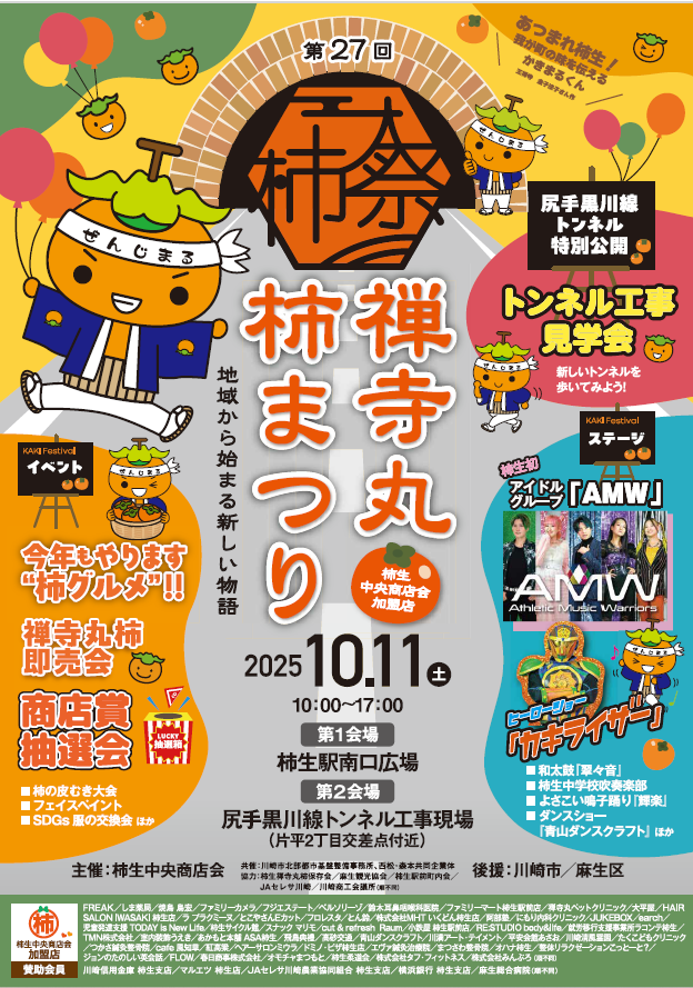 毎年多くの人で賑わう人気イベント「禅寺丸 柿まつり」。今年は10/11(土)、10:00~17:00まで開催。会場は柿生駅南口の広場と尻手黒川線のトンネル工事見学会会場の2か所。第一会場の駅前では、禅寺丸柿の販売、皮むき大会、抽選会を開催。第二会場のトンネル側では、現在進行中のトンネル見学会や歌や踊りのステージが楽しめます。ぜひ商店会へお越しください!